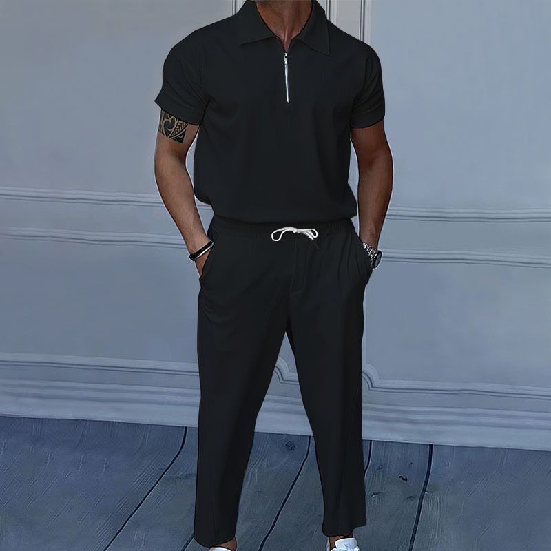 Men's Clothing Solid Color Polo Collar Short Sleeve Trousers Suit Black M