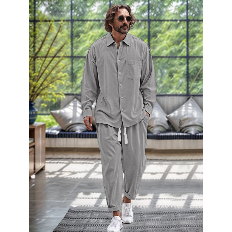 Men's Cotton And Linen Shirt Loose Long-sleeved Trousers Two-piece Suit Gray XL
