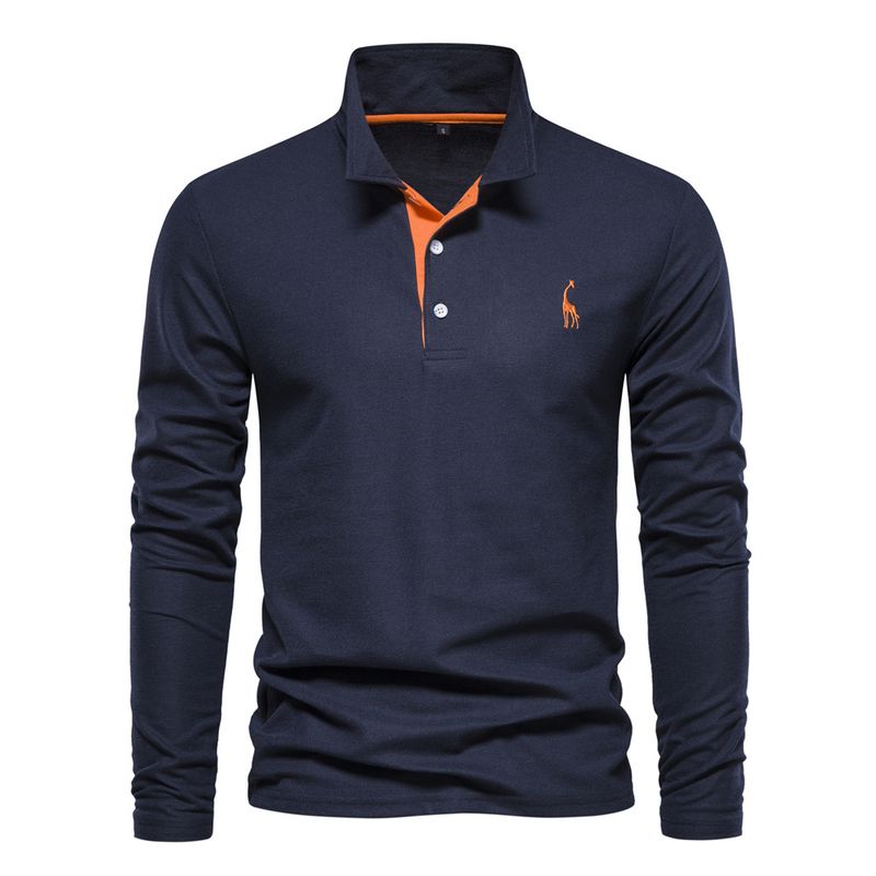 Men's Fashion Casual Polo Collar Deer Embroidered Long Sleeve Sapphire Blue S