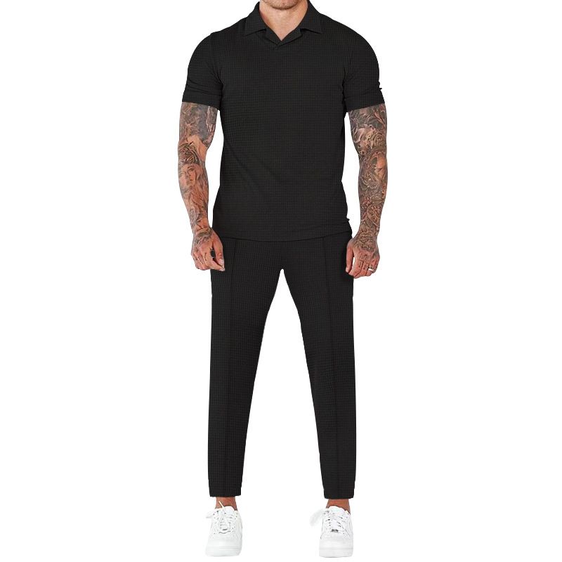 Men's Fashion Casual Waffle V-neck Polo Polo Short Sleeve Trousers Suit Black M