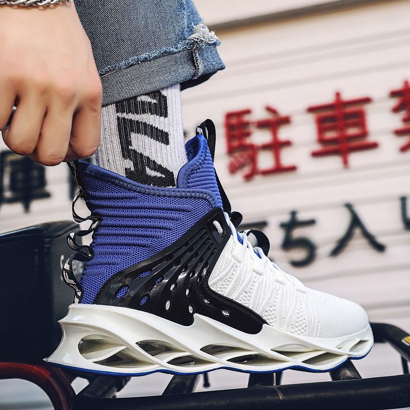 Men's Four Seasons Flyknit Breathable Blade Sole Mid-Top Sneakers White Blue 41