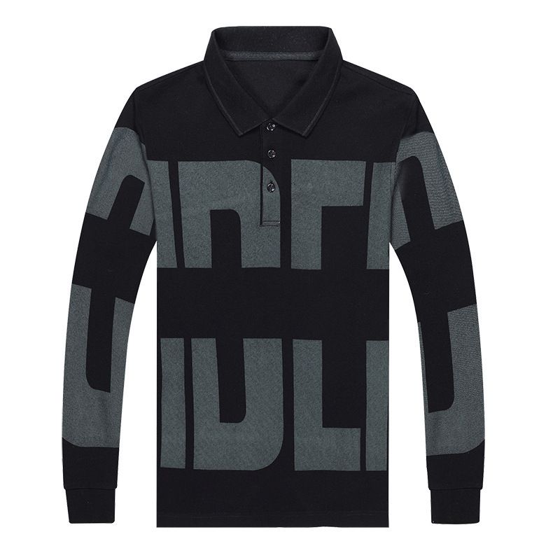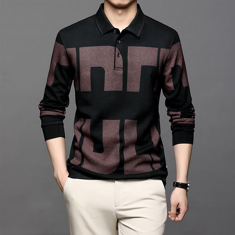 Men's Hong Kong Style Long Sleeve Polo Shirt Men's Lapel Printed T Shirt Red XL