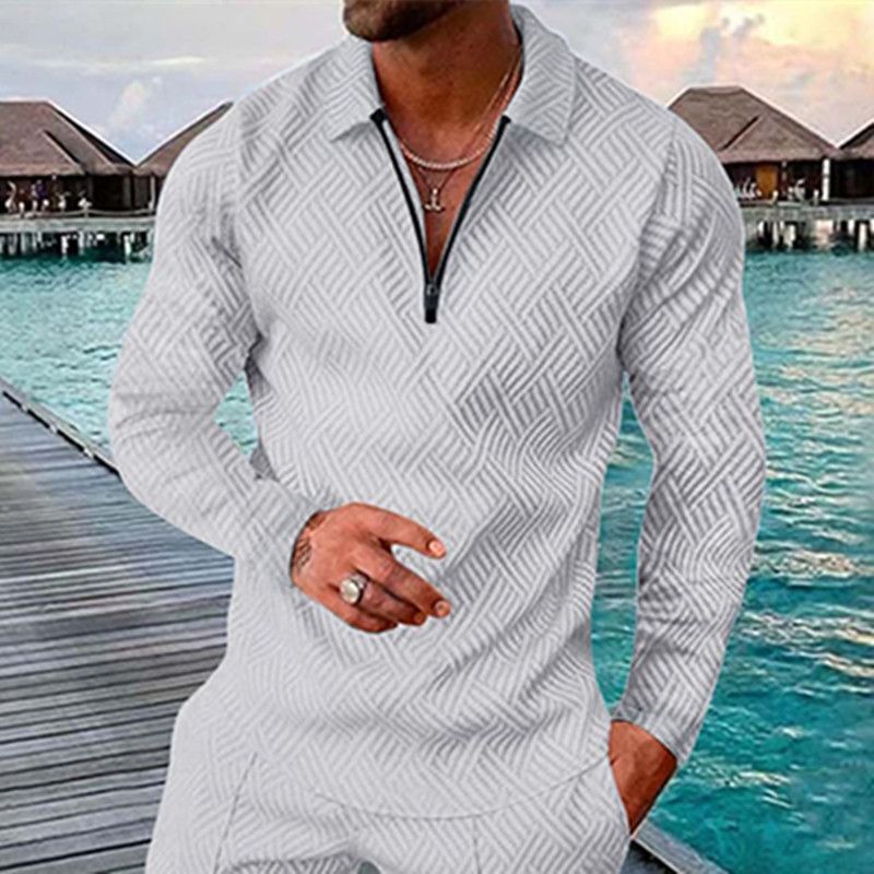 Men's Lapel Zipper Long Sleeve POLO Shirt New Casual T-Shirt Grey with white 2XL