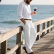 Men's Linen POLO Long-sleeved Trousers Casual Suit Solid Color Two-piece Set White XXXL