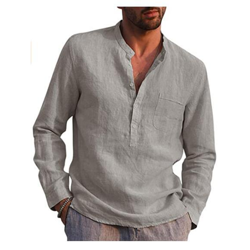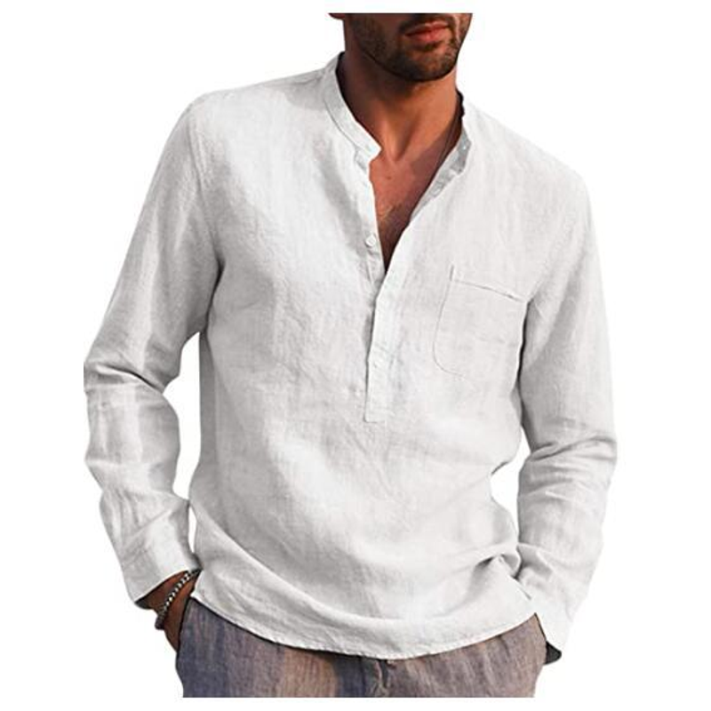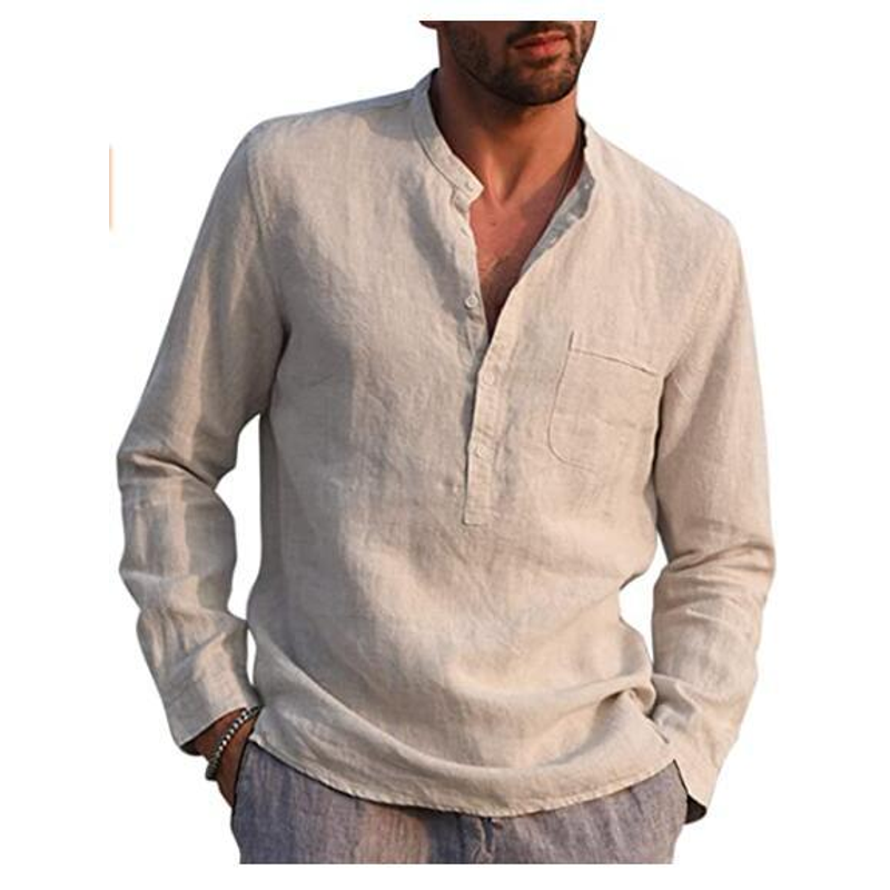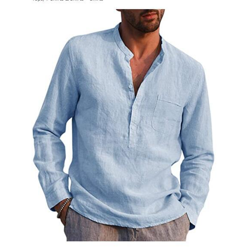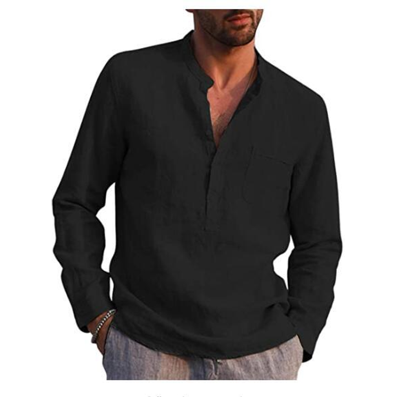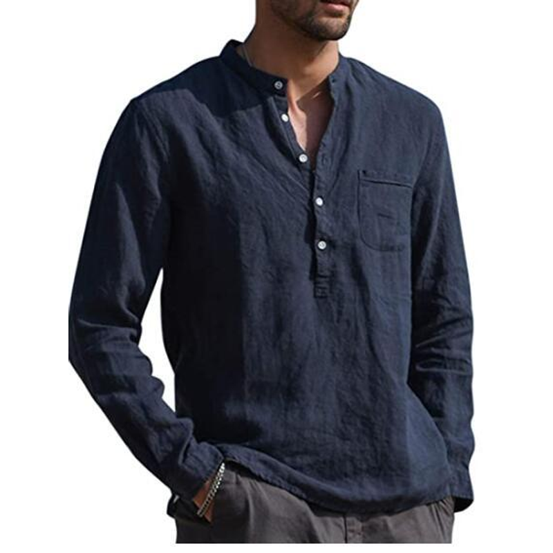 Men's Long Sleeved V Neck Casual Beach Linen Shirt For Men Navy Blue 3XL