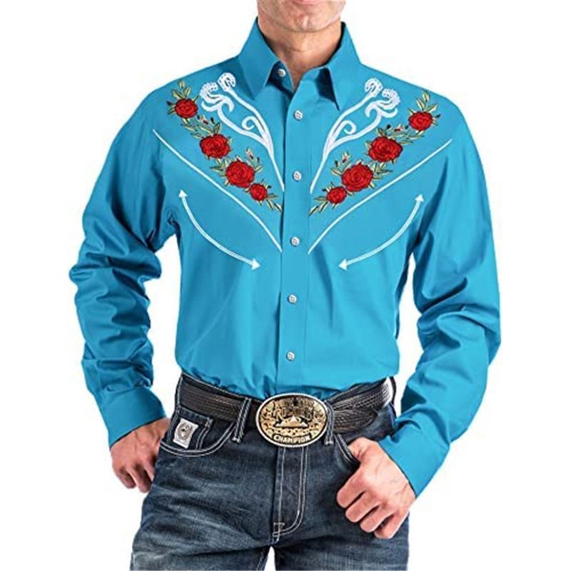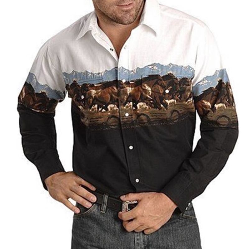Men's Outdoor Casual Polo Collar Long Sleeve Button Printed Top 6 Style M