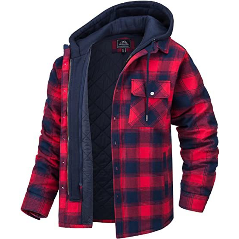 Men's Plaid Hooded Coat Winter Warm Button Zip-up Jacket Fashion Casual Thick Padded Long Sleeves Outerwear Clothing Red L