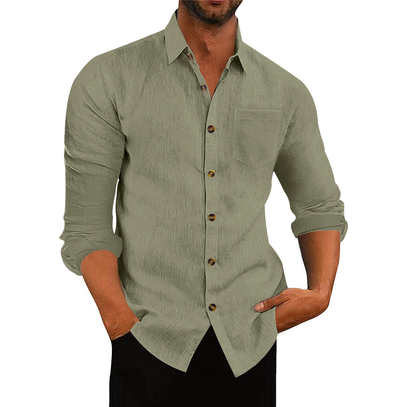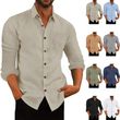 Men's Polo Collar Solid Color Long Sleeve Shirt Linen Loose Casual Cardigan Light Blue XXXL