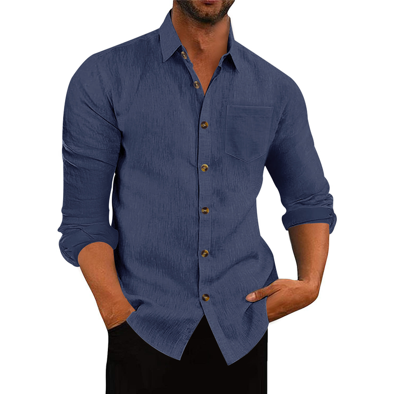 Men's Polo Collar Solid Color Long Sleeve Shirt Linen Loose Casual Cardigan Navy Blue XXL