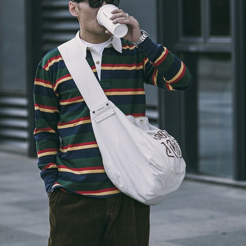 Men's Polo Collar Stripes T-shirt Retro Long Sleeve Yellow S