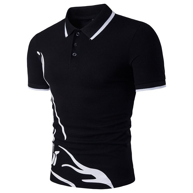 Men's Printed Lapel Polo Shirt Short Sleeves Black 3XL