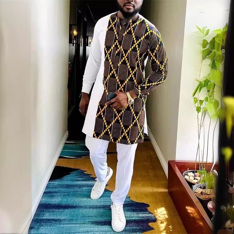 Men's Printed Long-sleeved Top Trousers African Suit White M