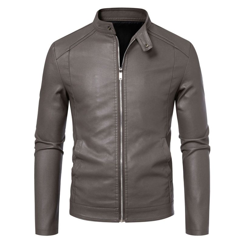 This men's faux leather jacket is crafted with premium smooth faux leather, offering a lightweight yet durable feel. It features a classic stand collar with a snap button, a full front zipper closure, and sleek stitching details for a tailored slim fit. The cuffs are designed with zippers for added style and adjustability, while the clean silhouette makes it versatile for casual outings, motorcycle rides, or daily wear in autumn and winter.