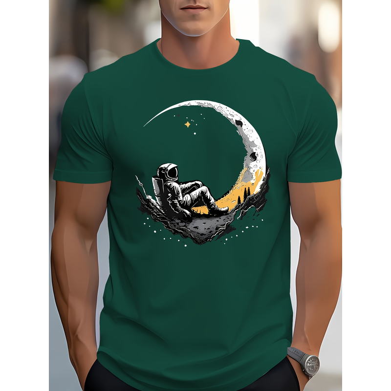 Men's summer 100 cotton fashionable casual loose plus size landing moon pattern printed sports round neck short sleeved T-shirt