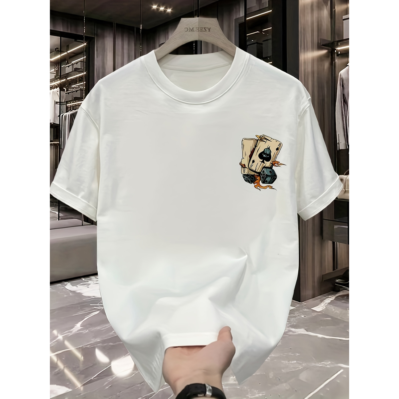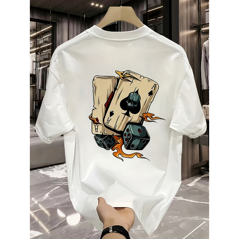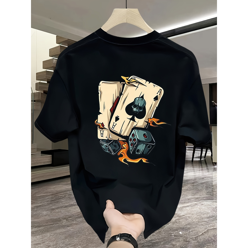 Men's summer 100% pure cotton fashionable casual loose creative poker and dice printed sports round neck short sleeved T-shirt
