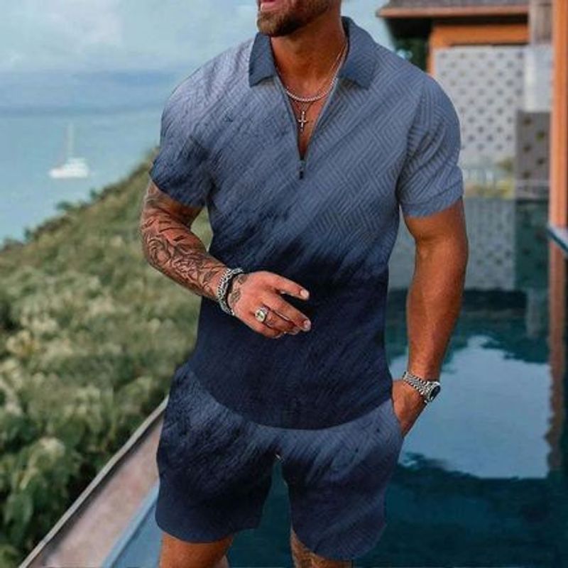 Men's Young Casual Versatile Simple Pattern Short Sleeve Zipper Polo Shirt Suit Amber S