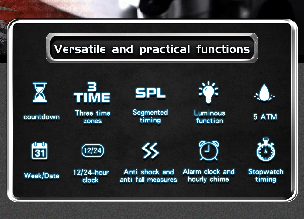 STOP WATCH,Back Light,Shock Resistant,LED display,Auto Date,Water Resistant,Alarm,Week Display
