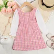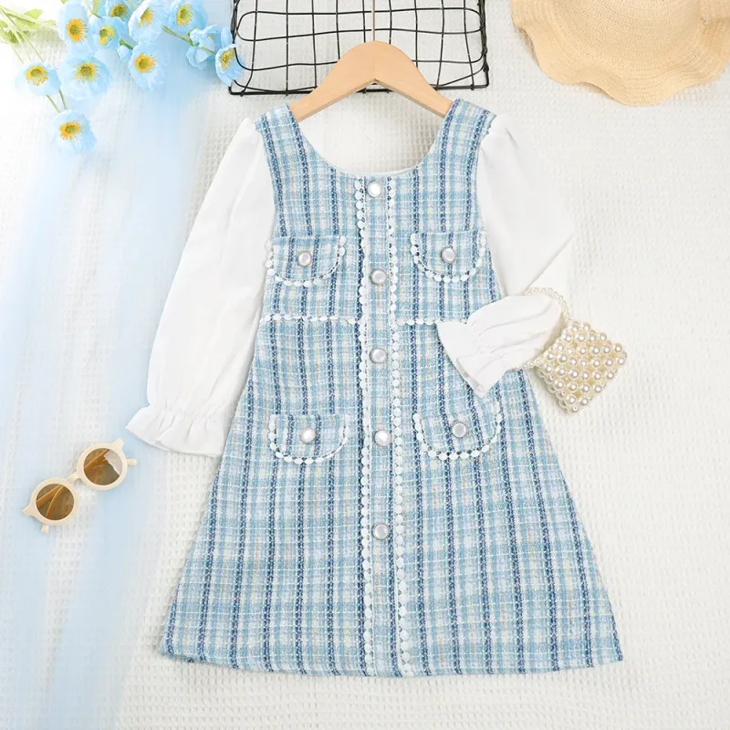 Menoea Girls' Dress 2023 Autumn New Girls' Round Neck Plaid Lace Button Long Sleeve Dress Girls' Fashion Patchwork Dress