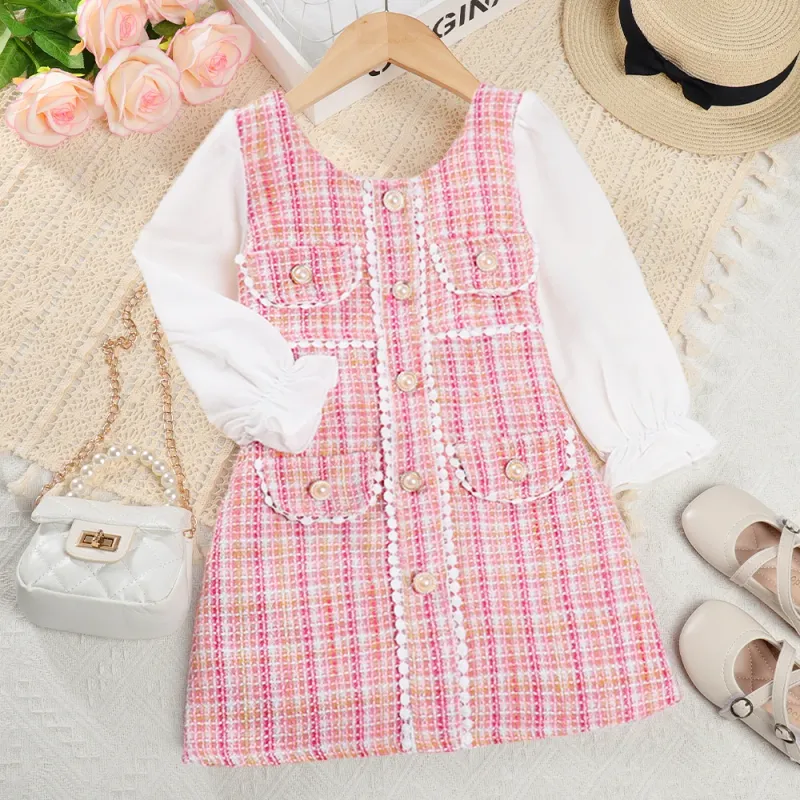 Menoea Girls' Dress 2023 Autumn New Girls' Round Neck Plaid Lace Button Long Sleeve Dress Girls' Fashion Patchwork Dress