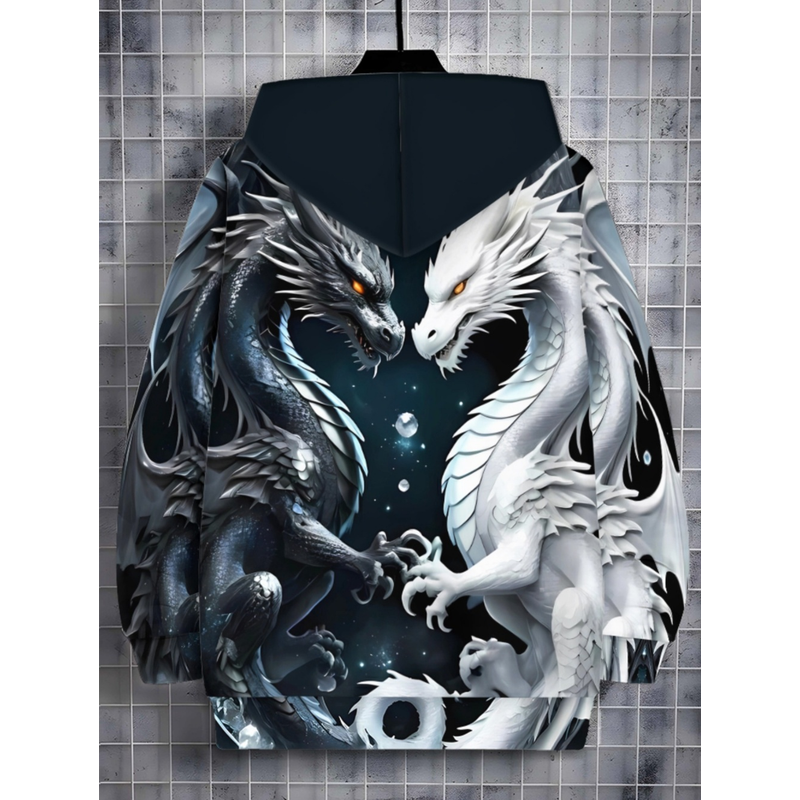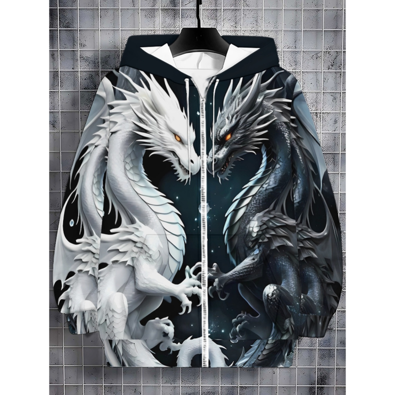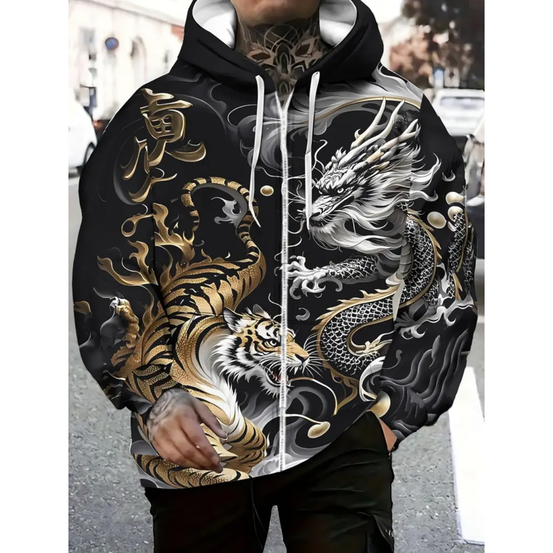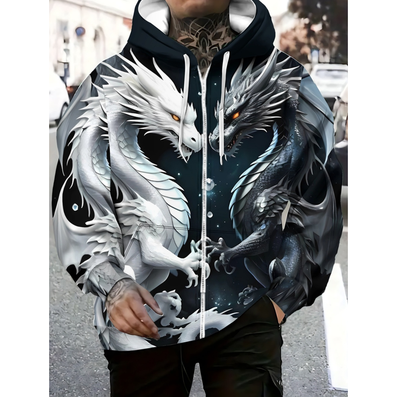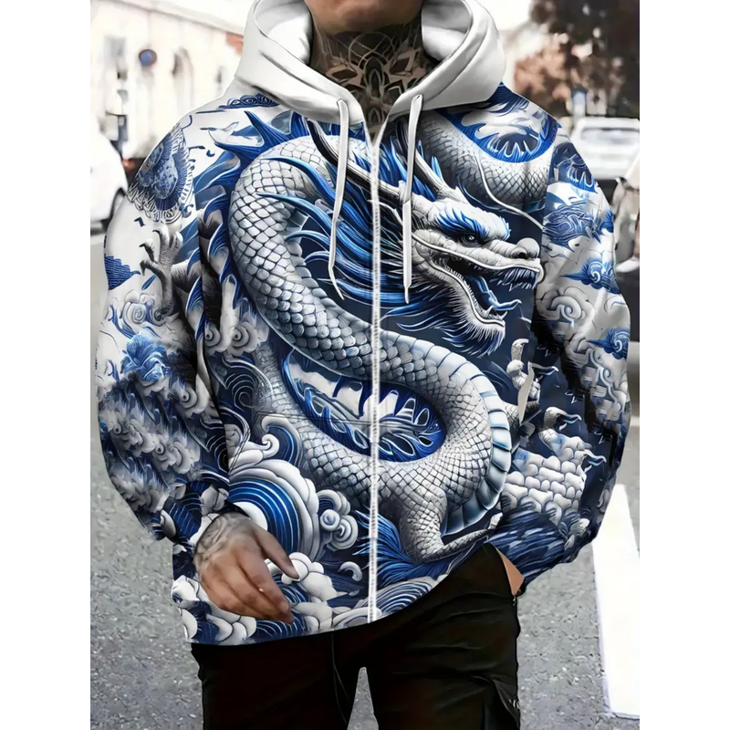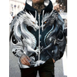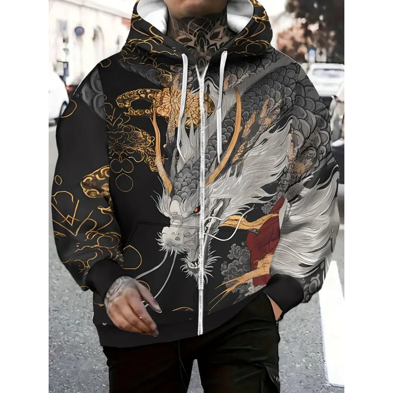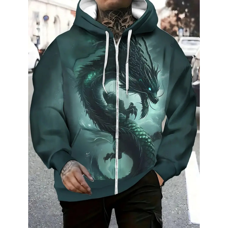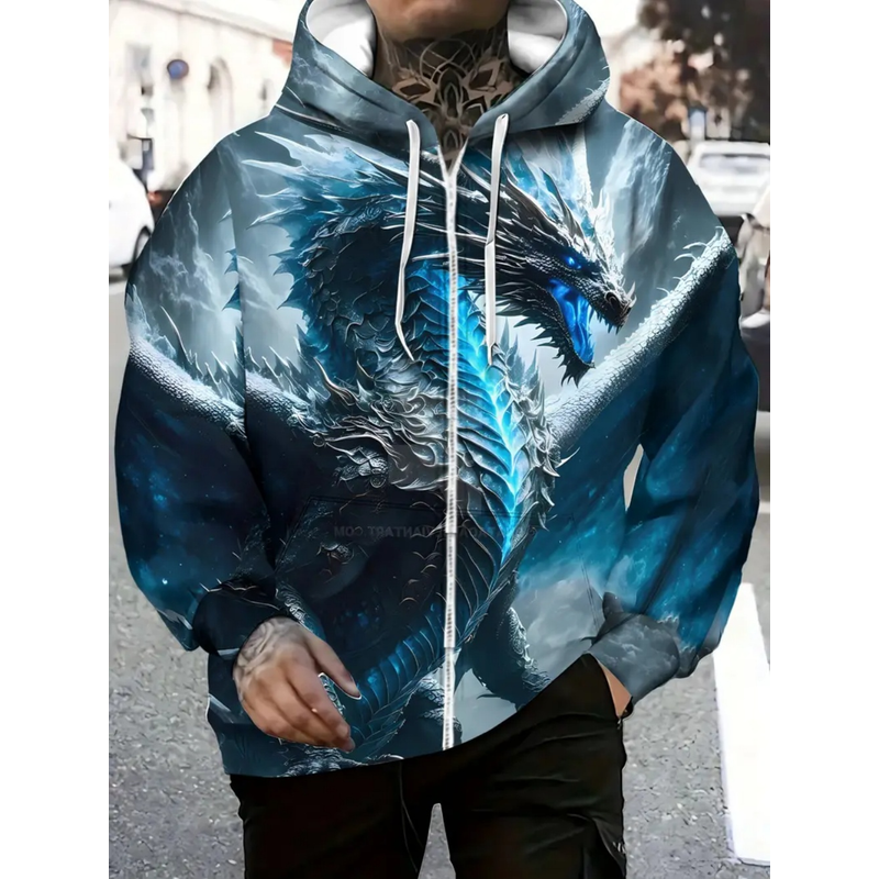 Mens Dragon Print Zipper Hoodie Outdoor Activities Travel Drawstring Long Sleeve Hoodies Autumn Winter Oversize Man Sweatshirts