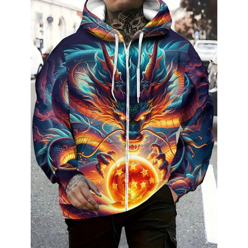 Mens Dragon Print Zipper Hoodie Outdoor Activities Travel Drawstring Long Sleeve Hoodies Autumn Winter Oversize Man Sweatshirts
