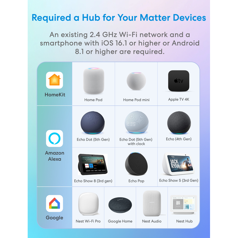 System requirement: Existing 2.4GHz Wi-Fi network. Smartphone running iOS 16.1 or later or Android 8.1 or later.