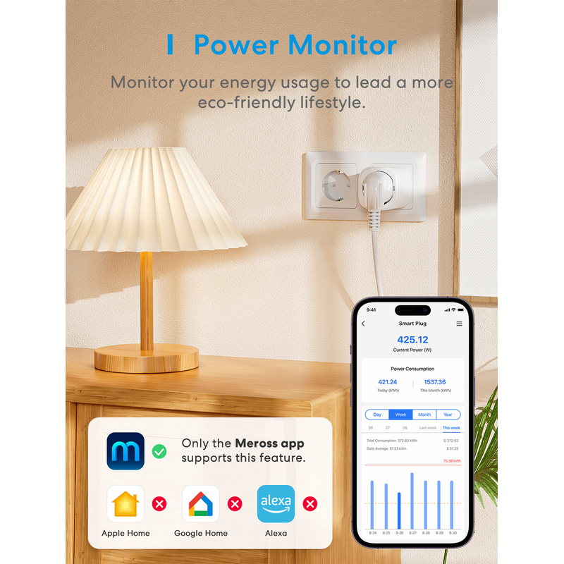 Energy monitor: Track power consumption to live a low-carbon life. With the internal electricity meter, the Meross app provides real-time reports on how much energy your devices consume and historical data.