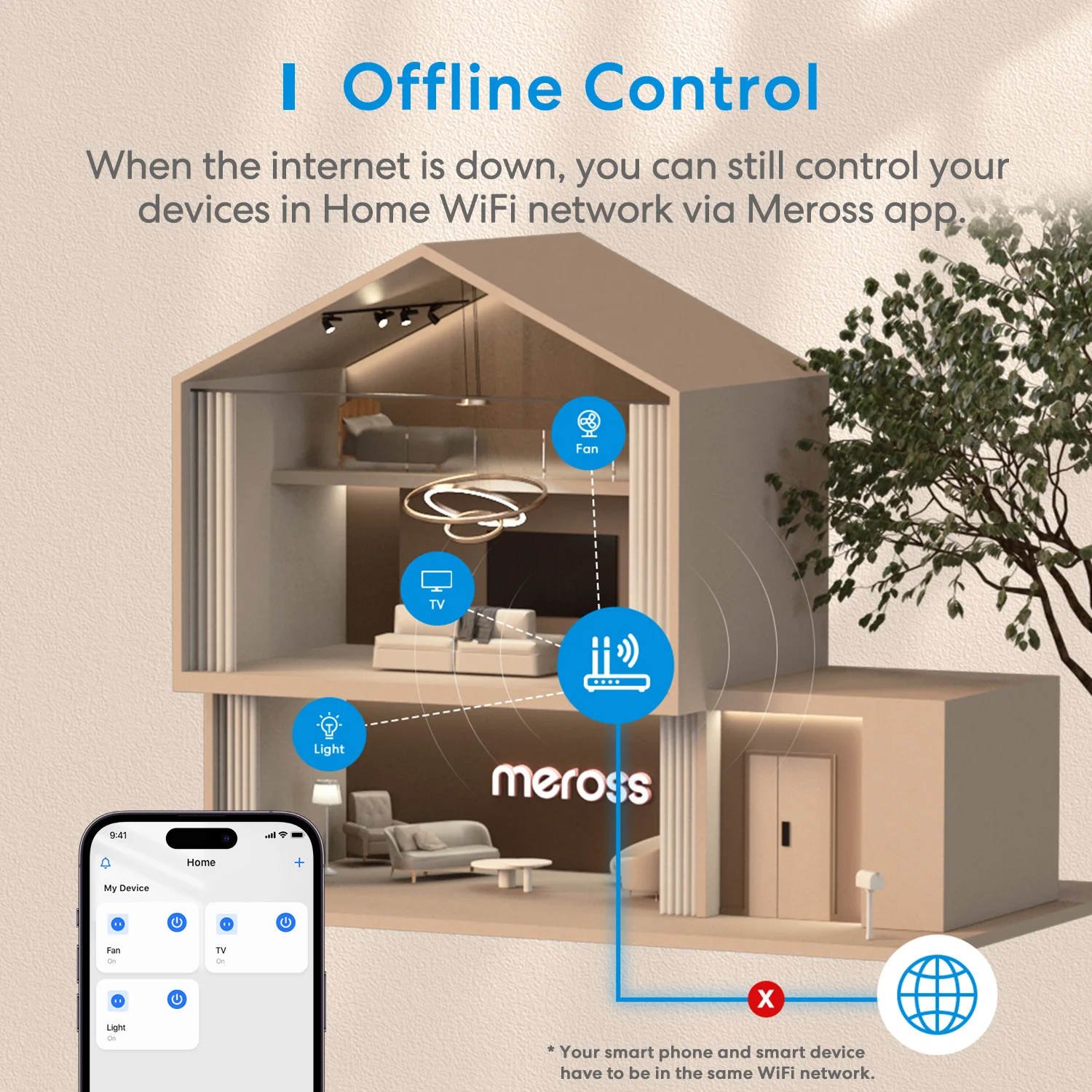 When the Internet is down,you can still control your devices in Home WI-FI network via Meross app.