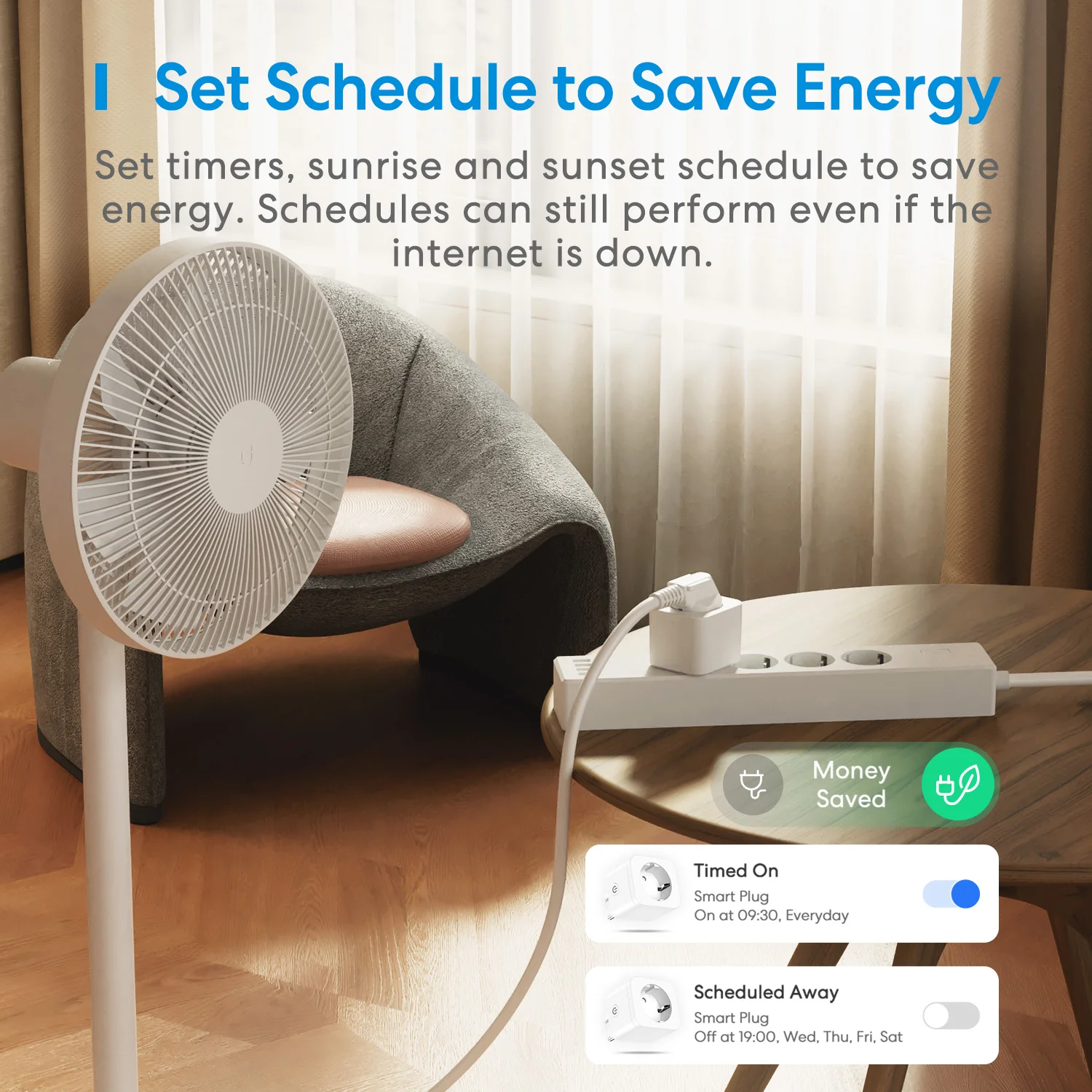 Set timers,sunrise and sunset schedule to save energy.Schedules can still perform even if the internet is down.