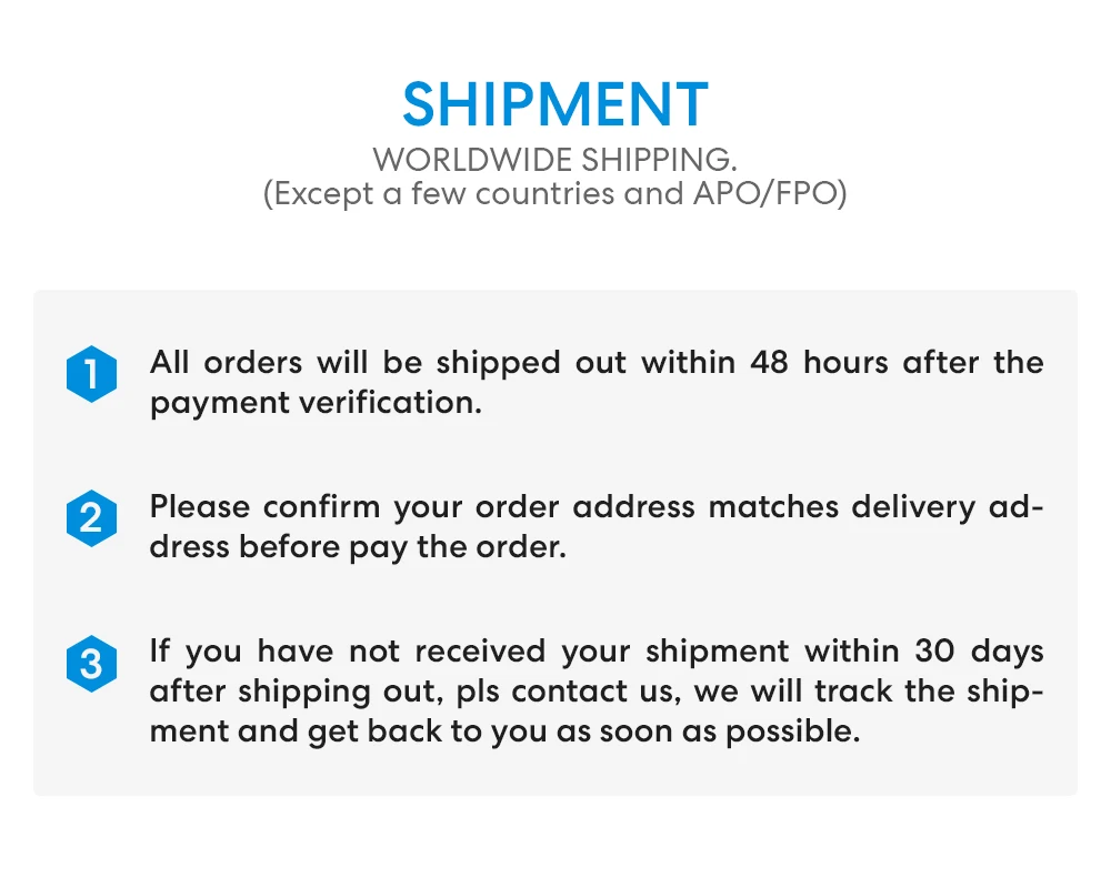 All orders are processed within 1–3 business days after payment confirmation. Orders are not processed or shipped on weekends or public holidays.