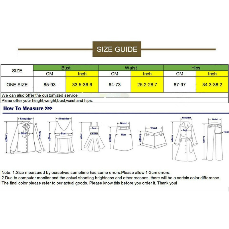 Note: 1. Asian sizes are 1 to 2 sizes smaller than European and American people. Choose the larger size if your size between two sizes. Please allow 2-3cm differences due to manual measurement. 2. Please check the size chart carefully before you buy the item, if you don't know how to choose size, please contact our customer service. 3.As you know, the different computers display colors differently, the color of the actual item may vary slightly from the following images.