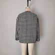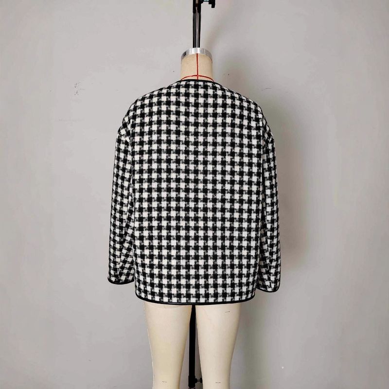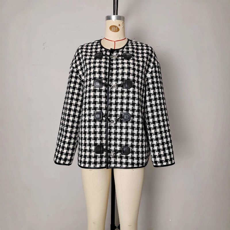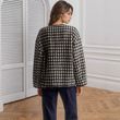 Metal Buckle Decorative Round Neck Hemming Shorts Jacket Black And White Plaid M