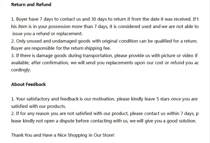 If you receive a damaged, defective, or incorrect item, please contact us within 7 days of delivery and provide clear photos of the product and packaging. We will arrange a replacement or full refund at no additional cost.