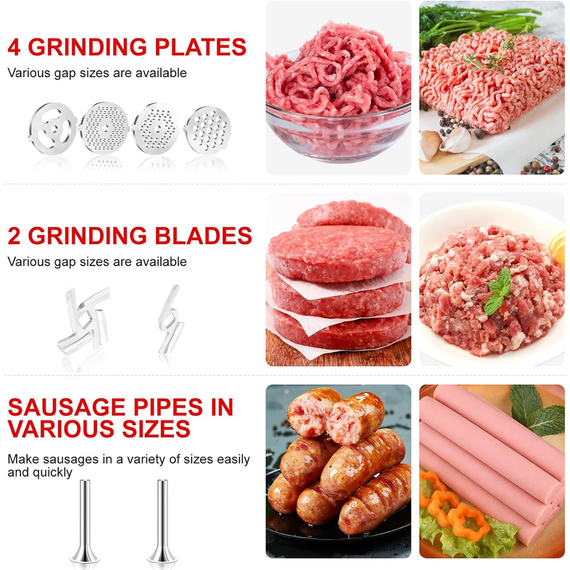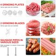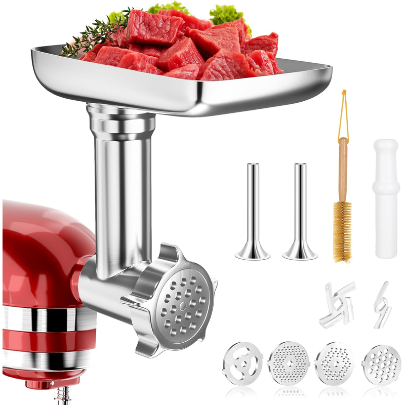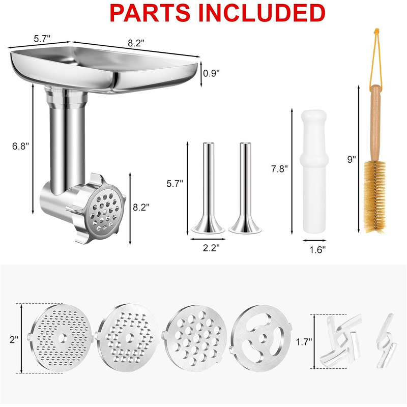 🌠[Multi-Function Food Grinder Attachment]: This attachment boasts sharper blades and superior performance for an excellent meat grinding setup. It includes 4 unique grinding trays (coarse, medium, fine, shredded), 2 larger sausage filling tubes, 2 grinding blades, a sausage filling holder, a spacious food tray, a food pusher, and a cleaning brush—everything you need to meet multiple kitchen needs.