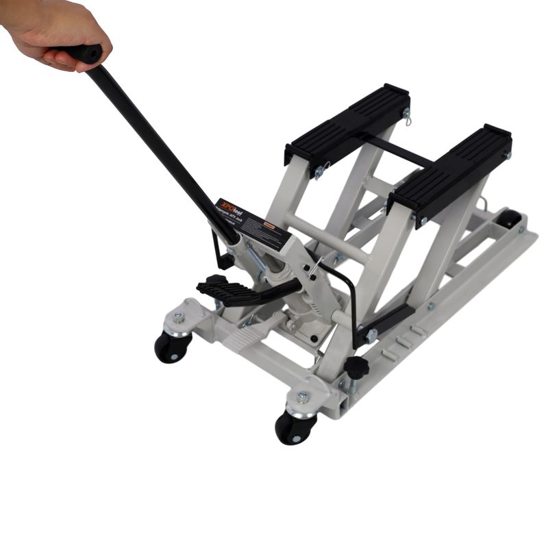 Product Name:Hydraulic Motorcycle Lift Jack, 1500 LBS Capacity ATV Scissor Lift Jack, Portable Motorcycle Lift Table with 4 Wheels, Hydraulic Foot-Operated Hoist Stand with 2xtie down gray