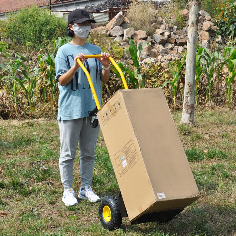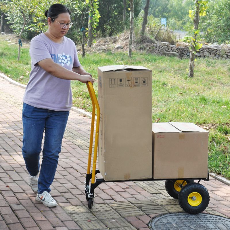 CONVERTIBLE DESIGN:Slide handle out of one set of tubes and into the other, the hand truck dolly can converts from two-wheeled hand truck to four-wheeled platform truck,Which can meet your different needs in different environments. HEAVY DUTY CONSTRUCTION:Made of sprayed metal,the platform cart with durable welded construction has high strength and not easy to deform.2 wheeled hand truck can hold 220lbs capacity and 4 wheeled platform truck can bear 330lbs capacity HIGH QUALITY WHEELS: Equipped with 2 8.25-inch pneumatic tires and 2 2-inch swivel casters,it can be used thousands of times without damage or deformation ,regardless of the load, it can run smoothly. EASY TO ASSEMBLE&CARRY: Only need to install four wheels, and the assembly can be completed in a short time according to the instructions.The shortest height of the two-wheeled trolley is 37 inches, easy to carry and store. MULTIPLE APPLICATIONS:Widely used for indoor and outdoor loading and unloading or moving,Such as warehouse,garden,construction site,hypermarket,office.