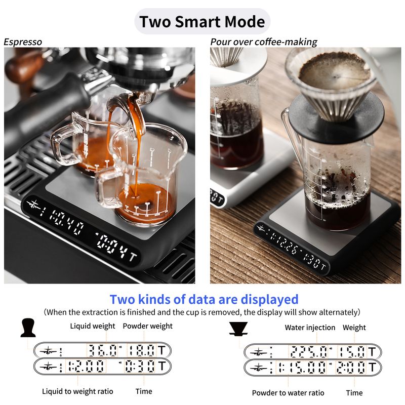 The digital kitchen coffee scale. Upgrade the solid-liquid detection chip, The timer starts automatically when liquid is detected. Add silent mode and sound mode. Excellent for cafe and home use