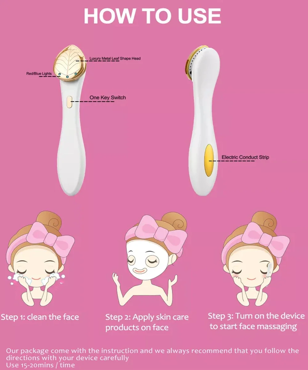 7.Portable Face massager designed 3 massage modes for you to choose from. they are gentle vibration with normal temperature, medium vibration + Red light + heat, strong vibration + EMS + heat. It helps to smooth tense face/neck/jaw muscles, de-puff and improve skin elasticity, maintain healthy glowing skin.