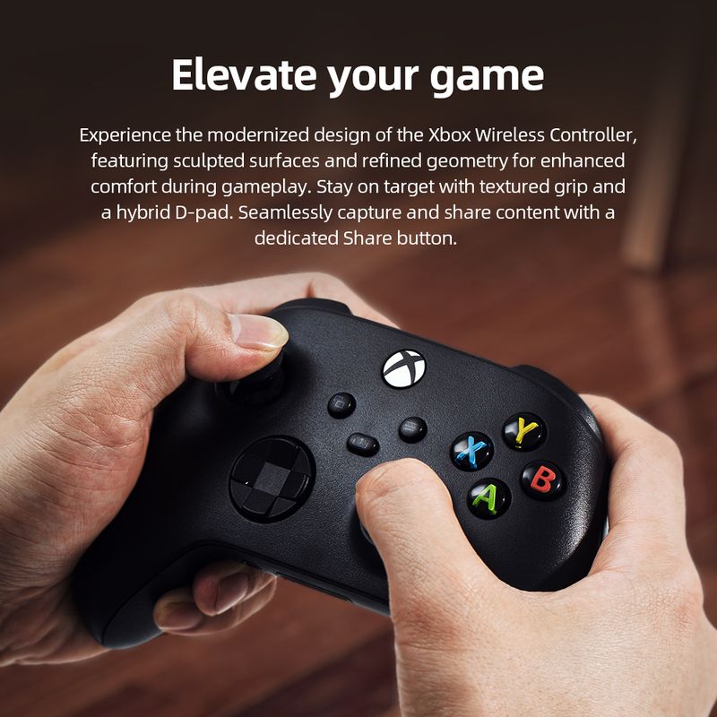 the modernized design of the Xbox Wireless Controller in Carbon Black,