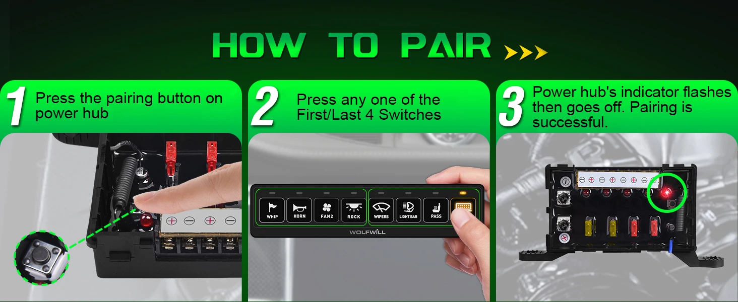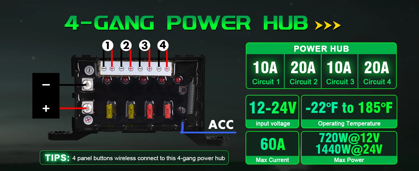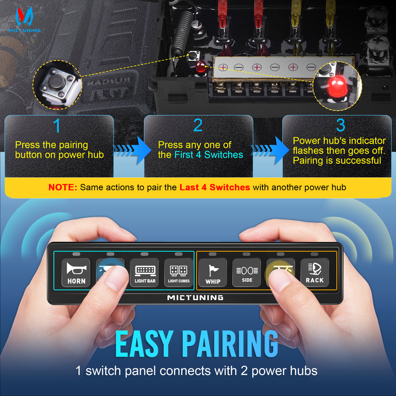 1. 1 Switch Panel, 2 Power Hubs - Assign the first four switches to Power Hub A and the last four to Power Hub B. Perfect for dual-battery vehicles, the dual-power hub design allows flexible placement at both the front & rear of the vehicle
