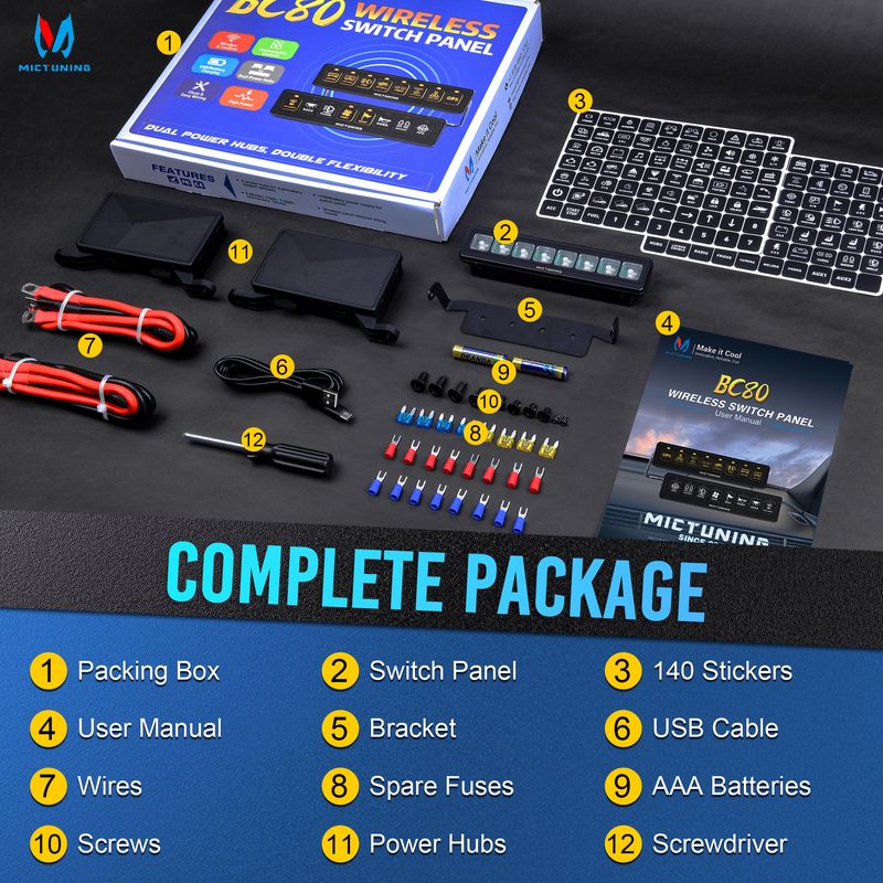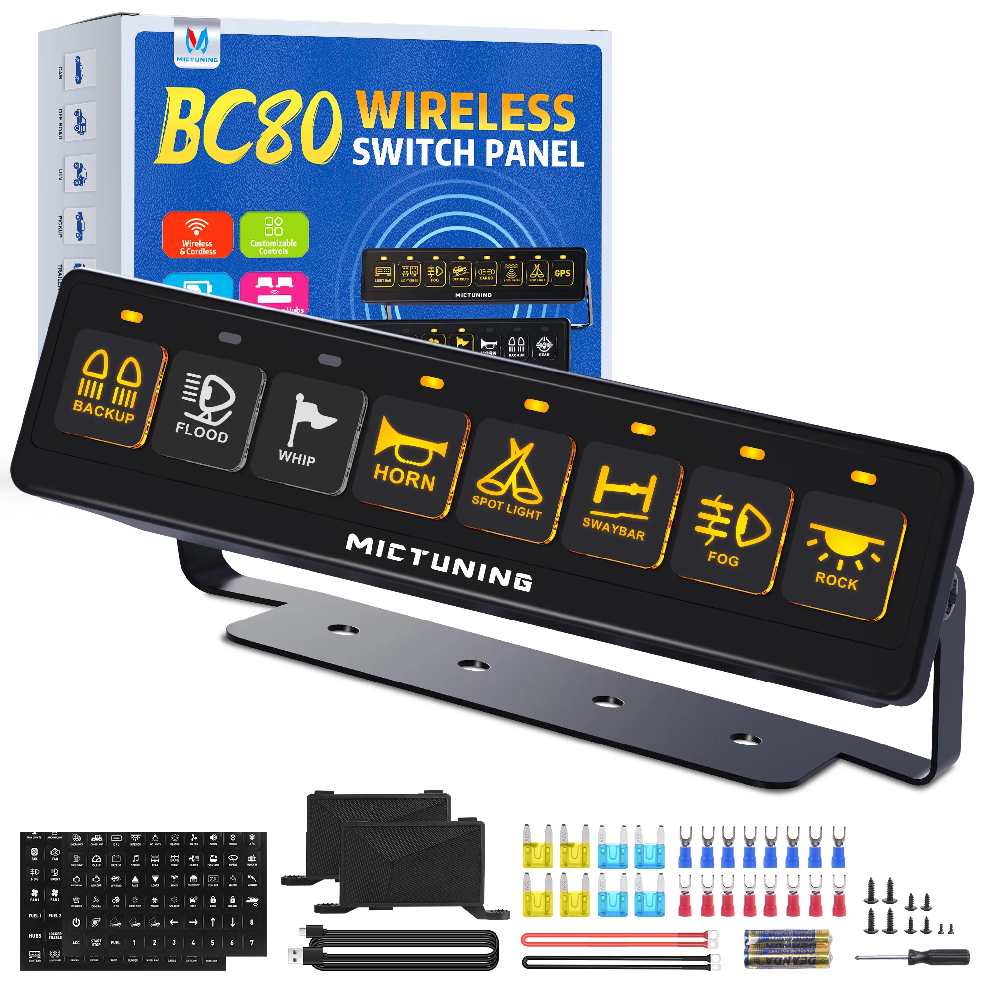 MICTUNING BC80 8-Gang Wireless Switch Panel, Dual Power Hubs, Auxiliary ON-OFF Relays Circuit Box, 4 Control Modes 12V 24V