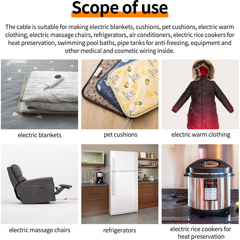 The cable is suitable for making electric blankets, cushions, pet mats, jade mattress, electric belts, electric warm clothing, electric shoes, electric massage chairs, refrigerators, air conditioners, freezers defrost, rice cooker insulation, pool bath, heated towel rail, pipeline tank antifreeze, window heating, equipment, and other medical and cosmetic lines for internal use.