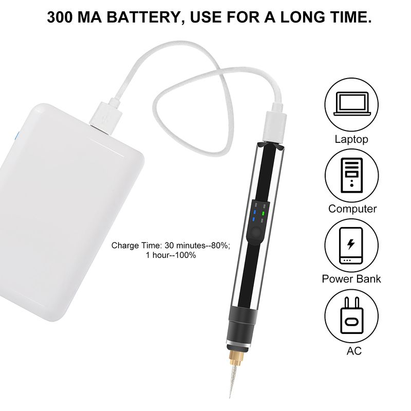5. Rechargeable engraving pen: The electric engraving pen is powered by lithium battery and can be recharged. No more disposable batteries!