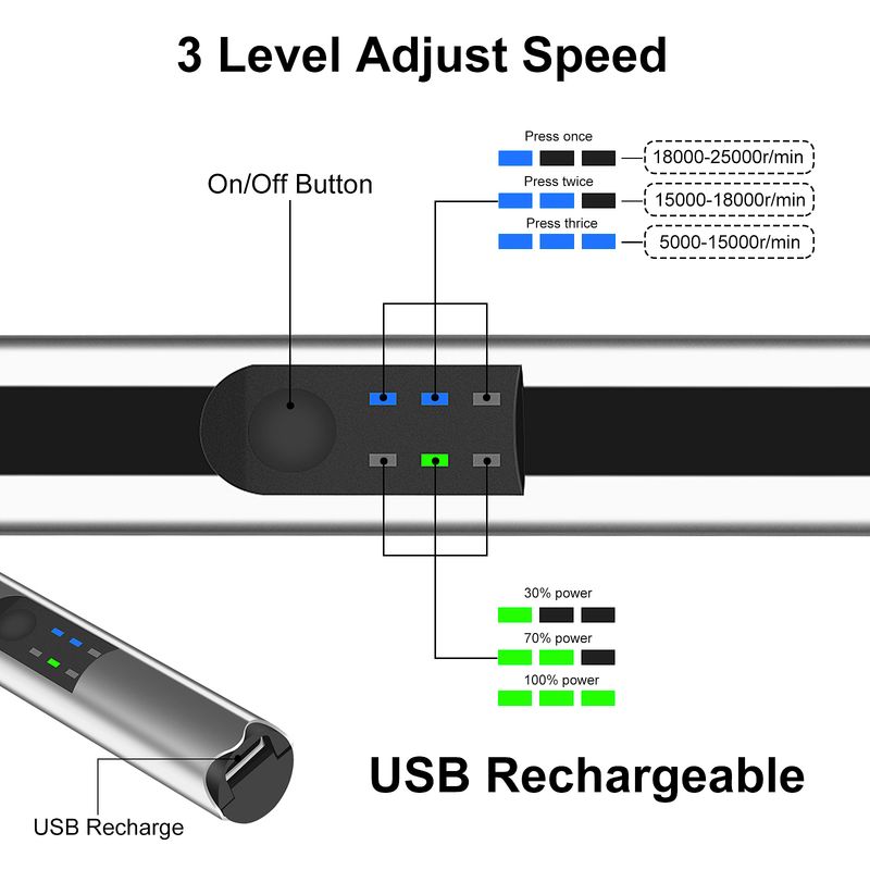 4. High Efficiency: This engraving pen can provide high speed of up to 5000-25000r/min, providing efficient engraving effect, three-speed adjustable, easier engraving.