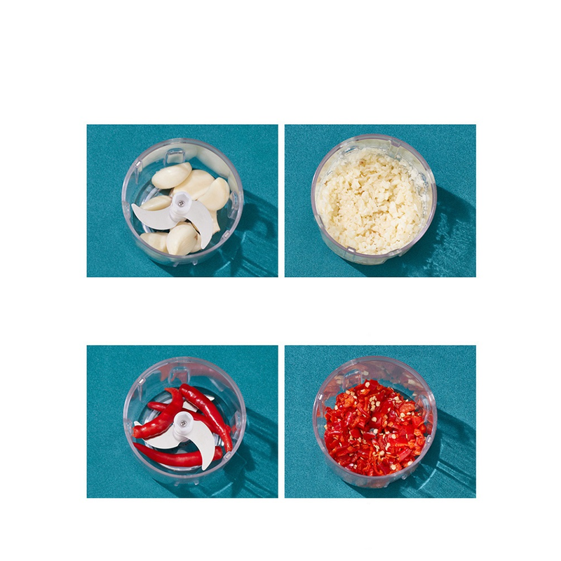 3. Fast Chopping: The sharp blade of the garlic cutter can quickly chop garlic, spices, nuts, vegetables, meat, ice cubes, etc. It's great for small meals. You can use it for cooking, baby food, and smoothie drinks.