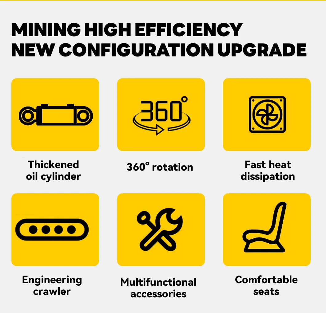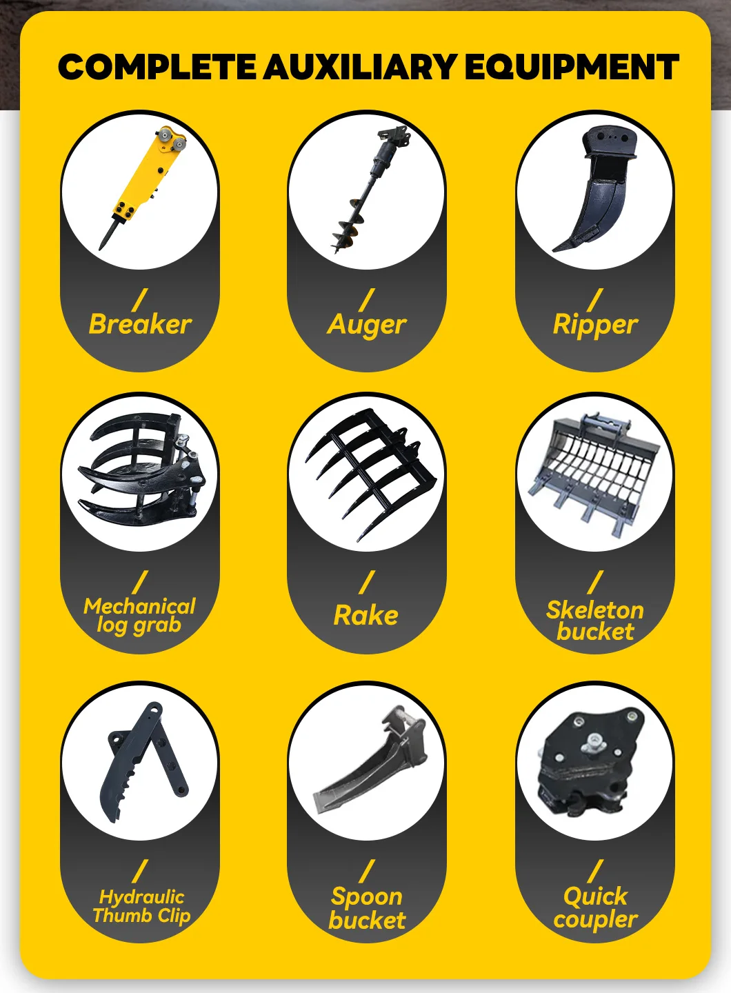 3. Attachments: Excavator with auger, grapple, hydraulic breaker, ripper, rake, tilt bucket, leveling bucket, rails, quick coupler, etc.