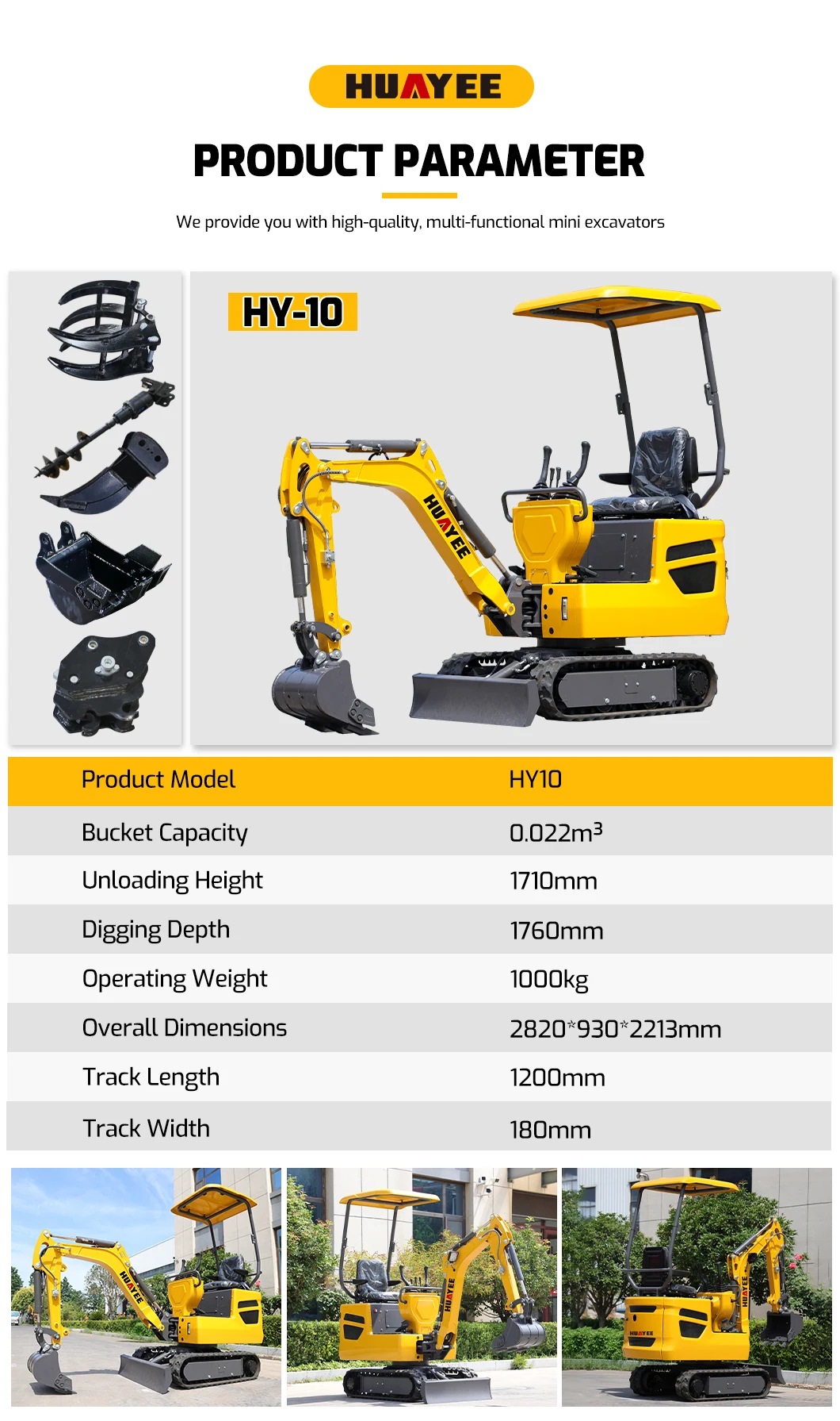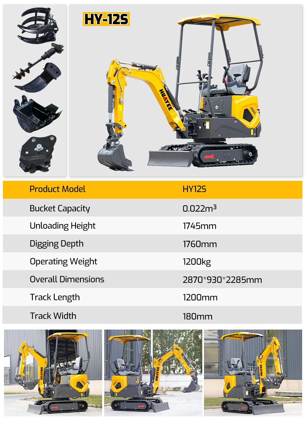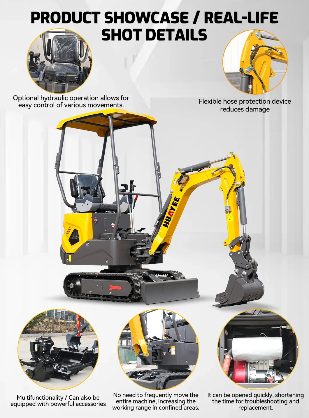Overall, the HUAYEE Mini Excavator 1 Ton is a highly versatile and practical machine, ideal for smaller projects requiring a combination of compactness, power, and efficiency.