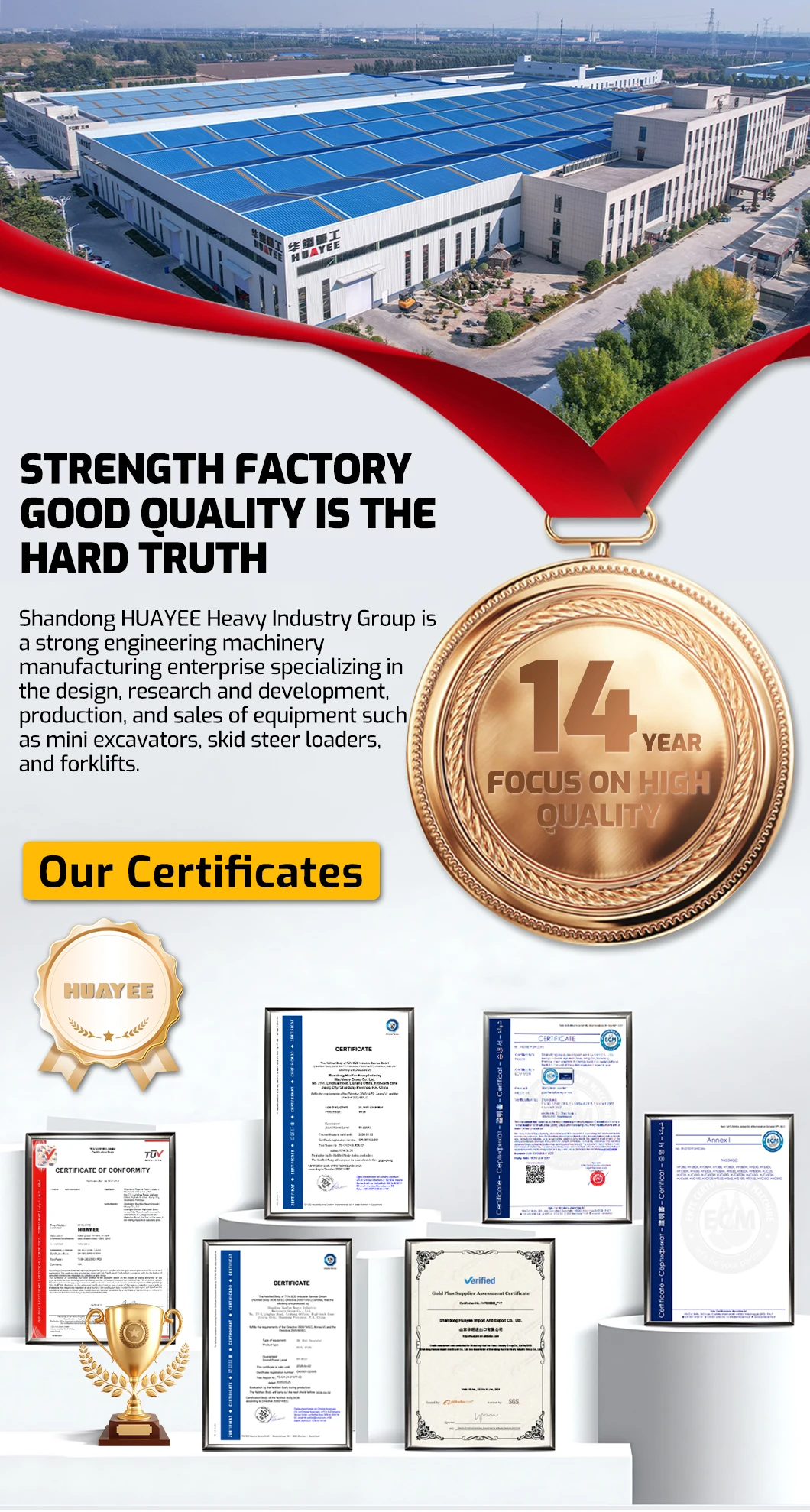 🏢Shandong HUAYEE Heavy Industry Group is a strong engineering machinery manufacturing enterprise specializing in the design, research and development, production, and sales of equipment such as mini excavators, skid steer loaders, and forklifts.