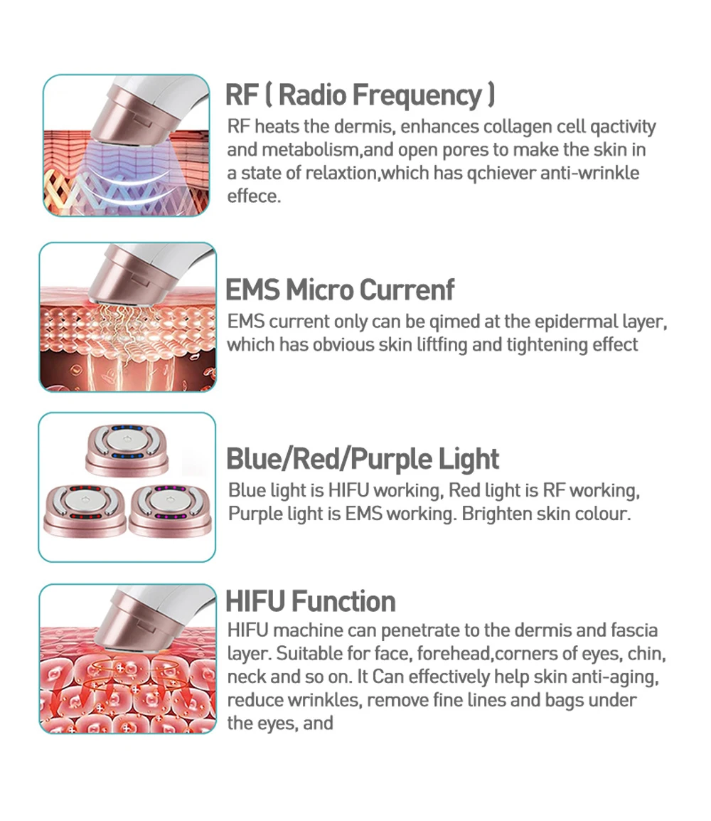 The portable skin care device lifts the skin and reduces the appearance of wrinkles. It is mainly used to tighten the skin on the face and neck. The use of these facial devices can achieve the effect of removing wrinkles, removing fine lines and lifting the face.