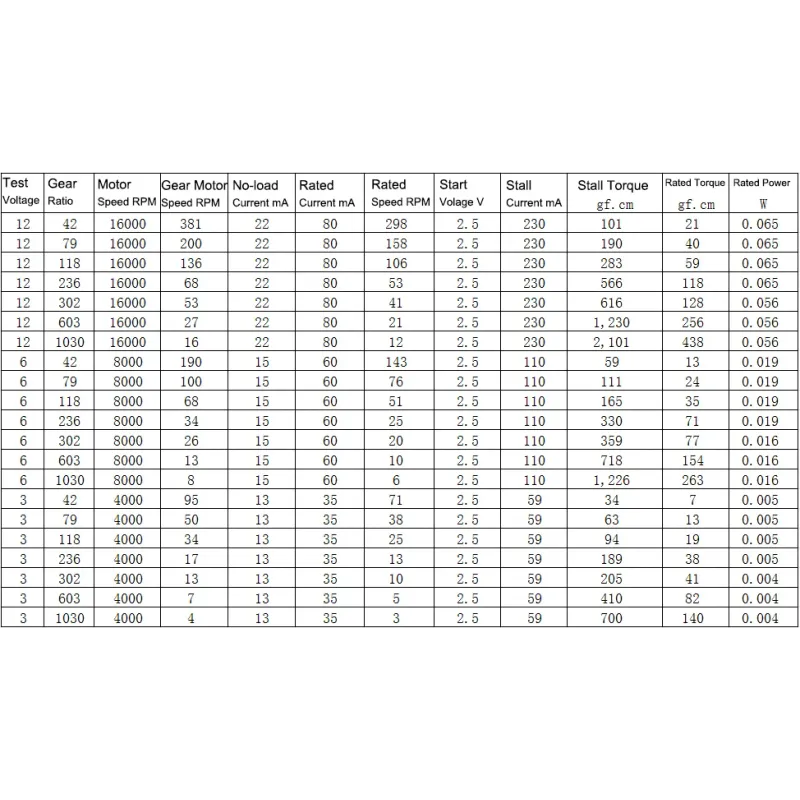 Tips:  The applicable voltage of each motor is 3V-12V. In this voltage range, the higher the voltage, the higher the speed, the greater the torque. Type A has the slowest speed and the largest torque. Type D has the fastest speed and the smallest torque.